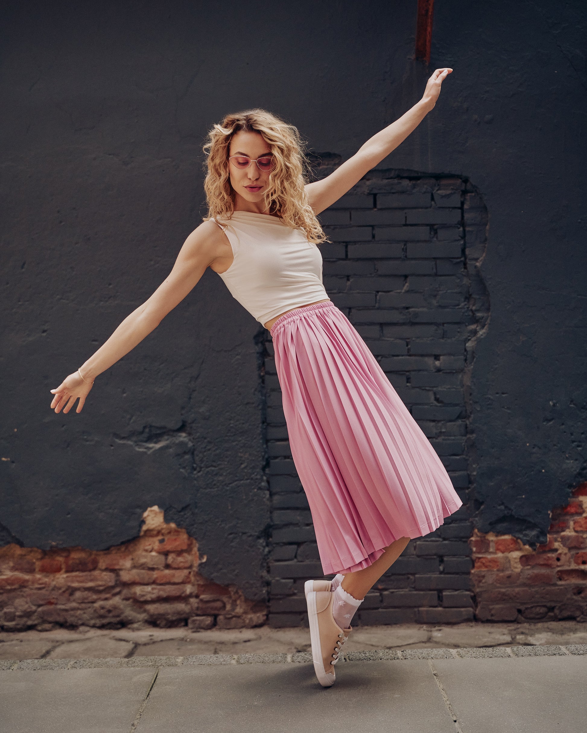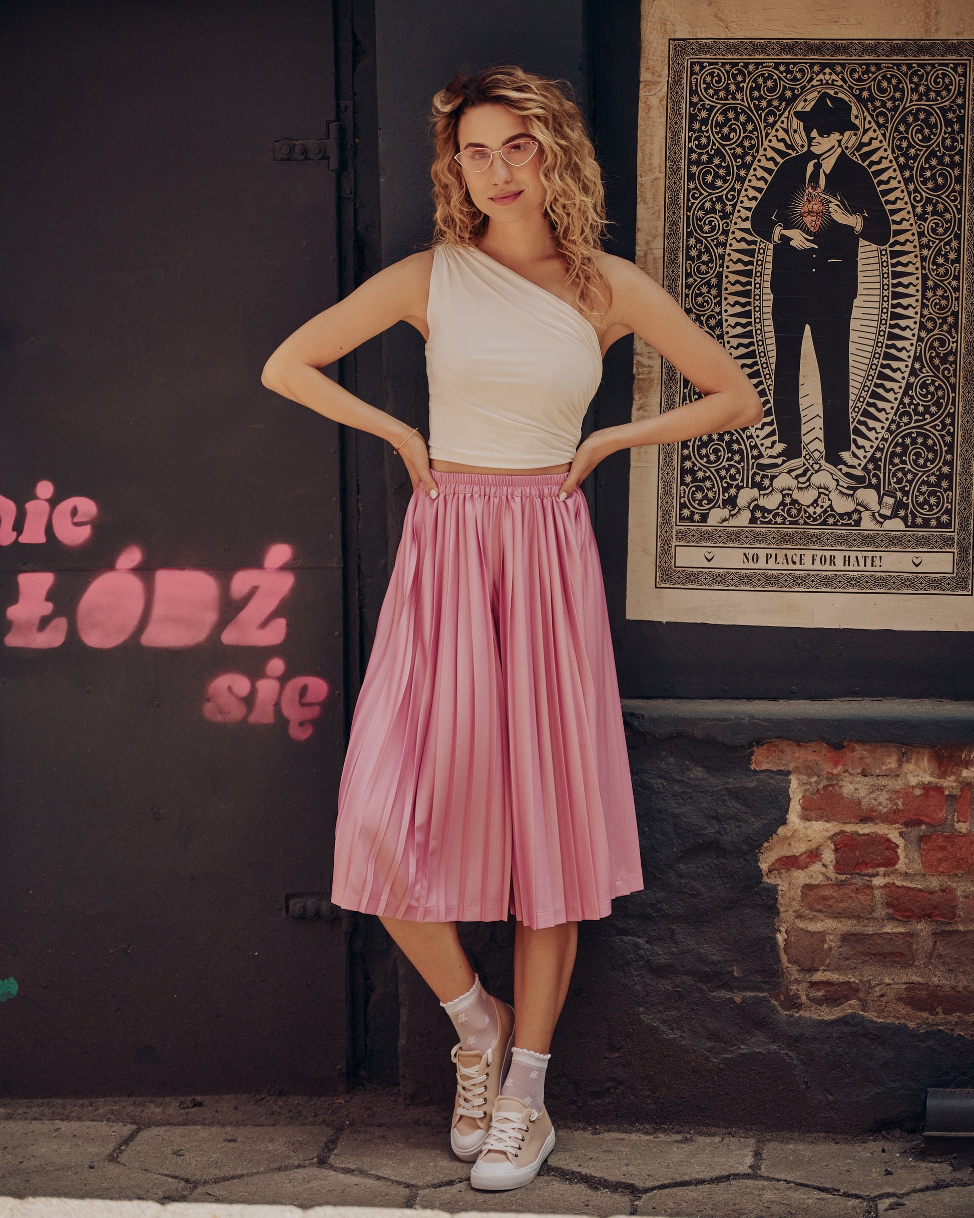 Pleated trousers with extremely wide and loose legs that form a skirt.