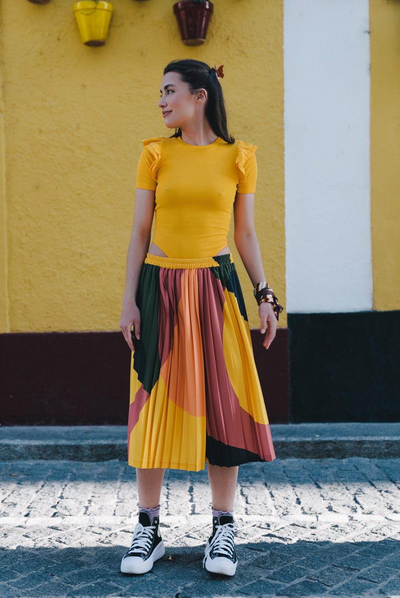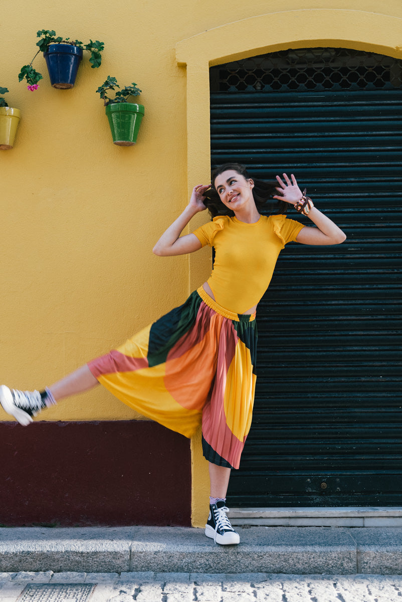 Pleated trousers with extremely wide and loose legs that form a skirt.